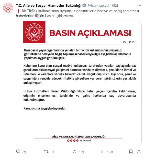 'Bazı basın yayın organlarında yer alan bir TikTok kullanıcısının uygunsuz görüntülerle hediye ve bağış toplaması haberleriyle ilgili aşağıdaki açıklamanın yapılması uygun görülmüştür.