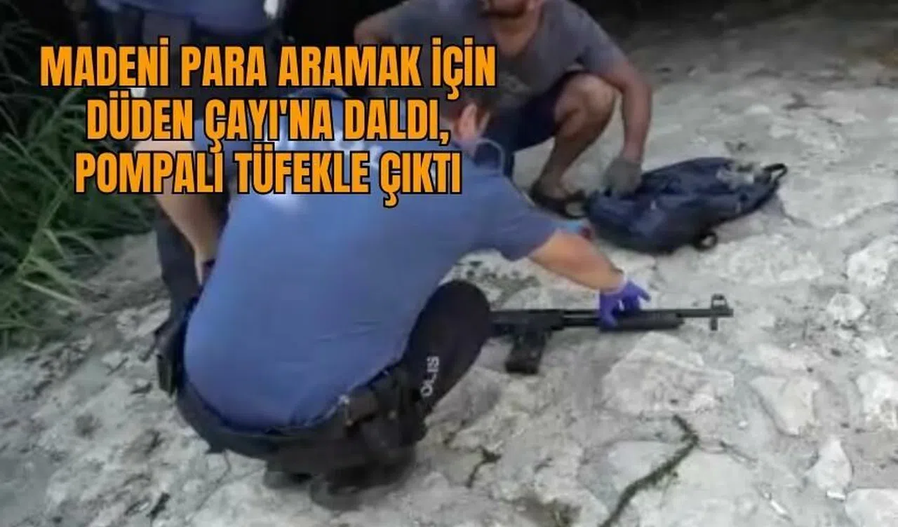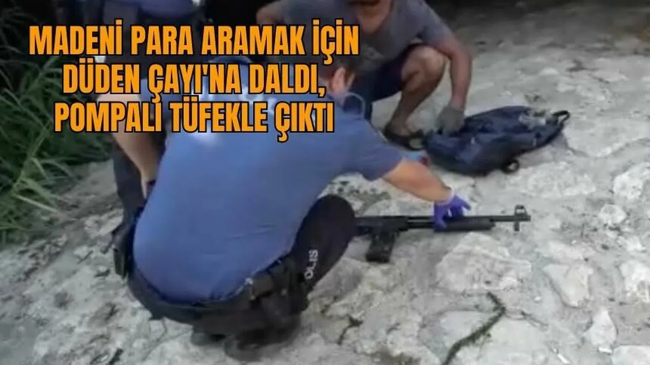 Olay, dün Muratpaşa ilçesi Çağlayan Mahallesi Bülent Ecevit Bulvarındaki köprünün altından geçen Düden Çayı’nda yaşandı. Denizden dalarak çıkardığı metal eşyaları geri dönüşüme satarak geçimini sağlayan 4 çocuk babası Erhan Uludağ (36), vatandaşların dilek tutmak için madeni para attığı çaya dalış yaptı. Yaklaşık 50 liraya yakın madeni para ve metal eşya bulan Uludağ, dalış esnasında suyun dibinde pompalı tüfek gördü. Neye uğradığını şaşıran adam, eldivenle tuttuğu pompalı tüfeği kıyıya çıkardı. Uludağ, durumu polis ekiplerine bildirdi. İhbarın ardından olay yerine gelen polis, tüfek üzerinde inceleme gerçekleştirdi.