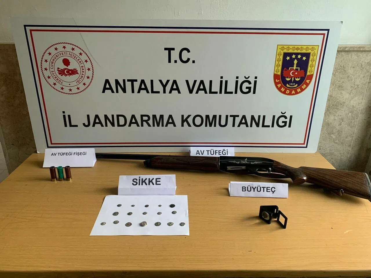 İlçe Jandarma Komutanlığı ekiplerinin tarihi eser kaçakçılarına yönelik yaptığı çalışma sonucunda, ilçede tarihi eser kaçakçılığı yapıldığı tespit edildi. Antalya İl Jandarma Komutanlığı KOM Şube Müdürlüğü ve Korkuteli JASAT Timi ile birlikte düzenlenen operasyon sonucunda kaçakçılığın yapıldığı tespit edilen bir otomobil durduruldu. Otomobilde ve içinde bulunan Y.A. ve Ş.Ç. üzerinde yapılan aramalarda 17 sikke, büyüteç, av tüfeği ve av tüfeğine ait 3 fişek bulundu. Olayla ilgili olarak adli işlem başlatıldı.