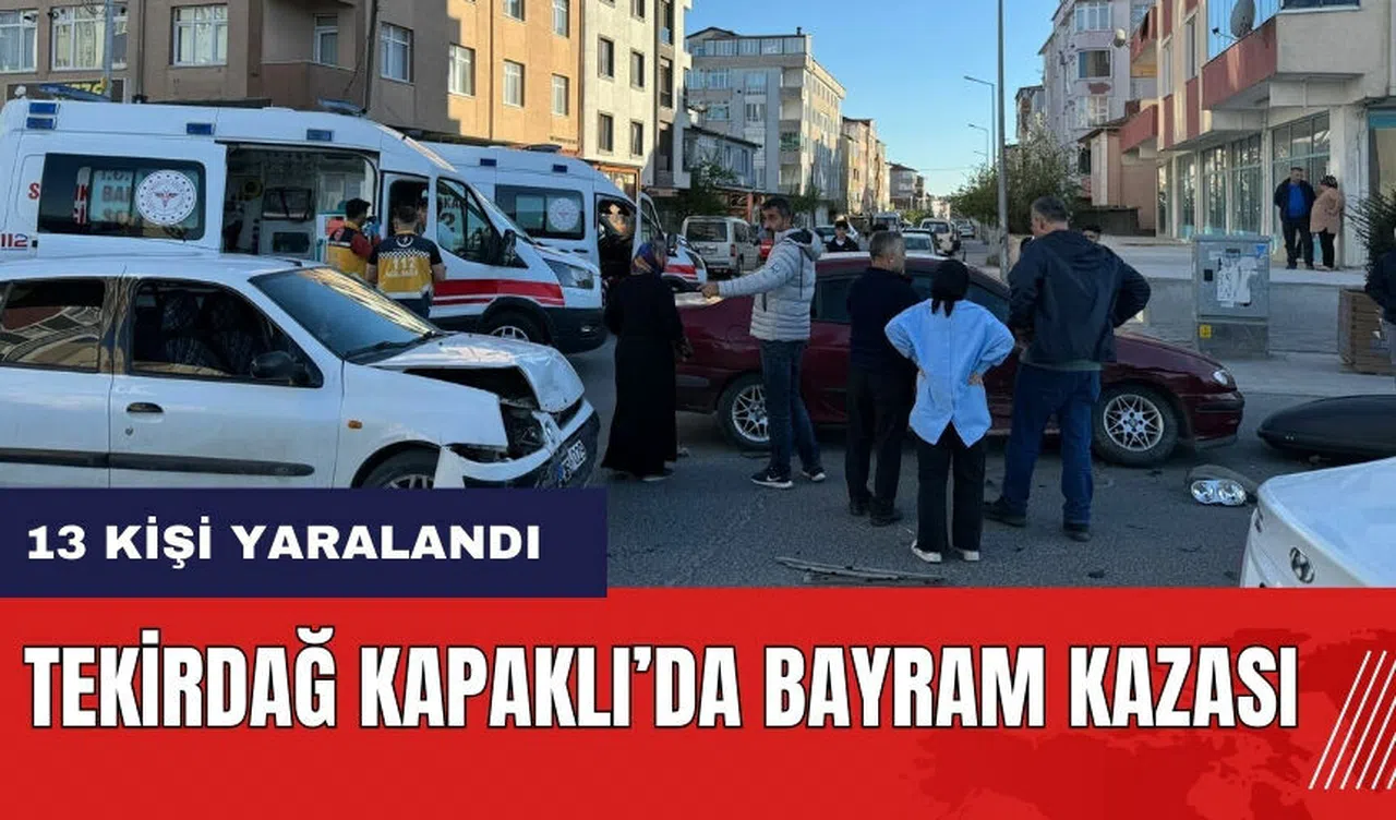 Tekirdağ'ın Kapaklı ilçesinde, otomobillerin çarpışması sonucu meydana gelen kaza, 13 kişinin yaralanmasına neden oldu. Olay, Atatürk Mahallesi Erbay Caddesi Aşıklar Sokak'ta gerçekleşti.