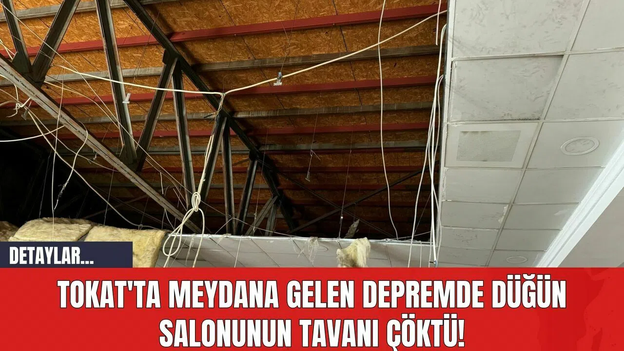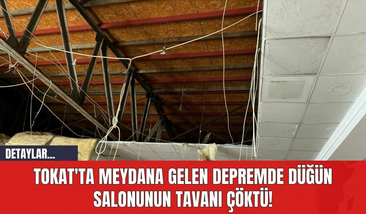 Depremin etkisiyle Turhal ilçesinde bulunan bir düğün salonunda tavan çökmesi yaşandı. Nişan merasimi sırasında, salonun tavanında bulunan taş yün ve onları taşıyan levhalar, masaların üzerine düştü.