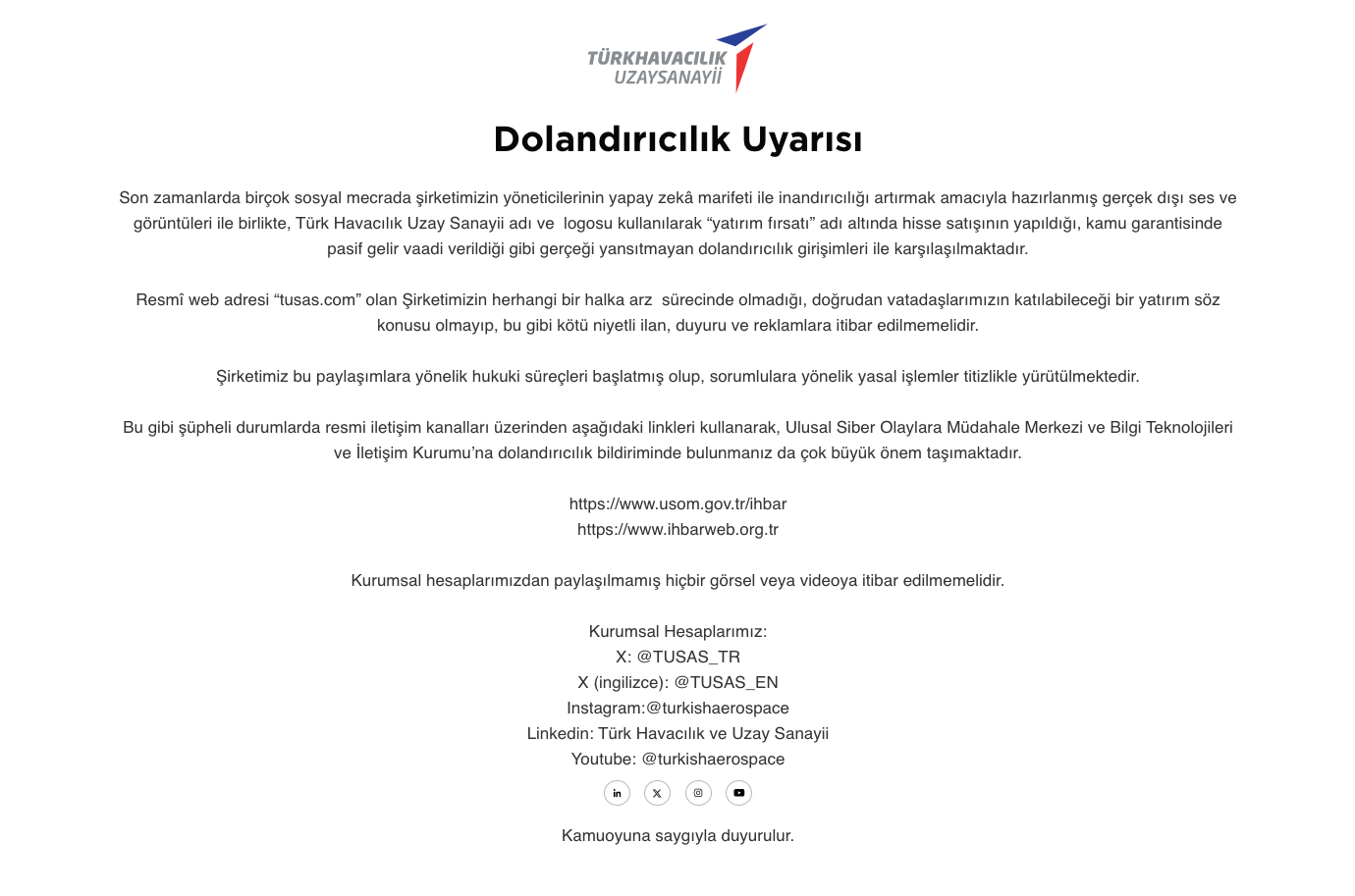 Terör saldırısına hedef olan TUSAŞ’a ait www.tusas.com web adresine giren vatandaşlarsa dikkat çeken bir uyarıyla karşılaştı. TUSAŞ tarafından yapılan uyarıda, “Son zamanlarda birçok sosyal mecrada şirketimizin yöneticilerinin yapay zeka marifeti ile inandırıcılığı artırmak amacıyla hazırlanmış gerçek dışı ses ve görüntüleri ile birlikte, Türk Havacılık Uzay Sanayii adı ve logosu kullanılarak “yatırım fırsatı” adı altında hisse satışının yapıldığını, kamu garantisinde pasif gelir vaadi verildiği gibi gerçeği yansıtmayan dolandırıcılık girişimleri ile karşılaşılmaktadır. Resmi web adresi “tusas.com” olan şirketimizin herhangi bir halka arz sürecinde olmadığı, doğrudan vatandaşlarımızın katılabileceği bir yatırım söz konusu olmayıp, bu gibi kötü niyetli ilan, duyuru ve reklamlara itibar edilmemelidir. Şirketimizin bu paylaşımlara yönelik hukuki süreçleri başlamış olup, sorumlulara yönelik yasal işlemler titizlikle yürütülmektedir” denildi.