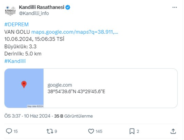 Boğaziçi Üniversitesi Kandilli Rasathanesi ve Deprem Araştırma Enstitüsü, Van Gölü'nde 3.3 büyüklüğünde bir deprem meydana geldiği duyuruldu. Depremin, saat 15:06:35'de gerçekleştiği belirtilirken, derinliğinin ise 5.0 kilometre olduğu kaydedildi.