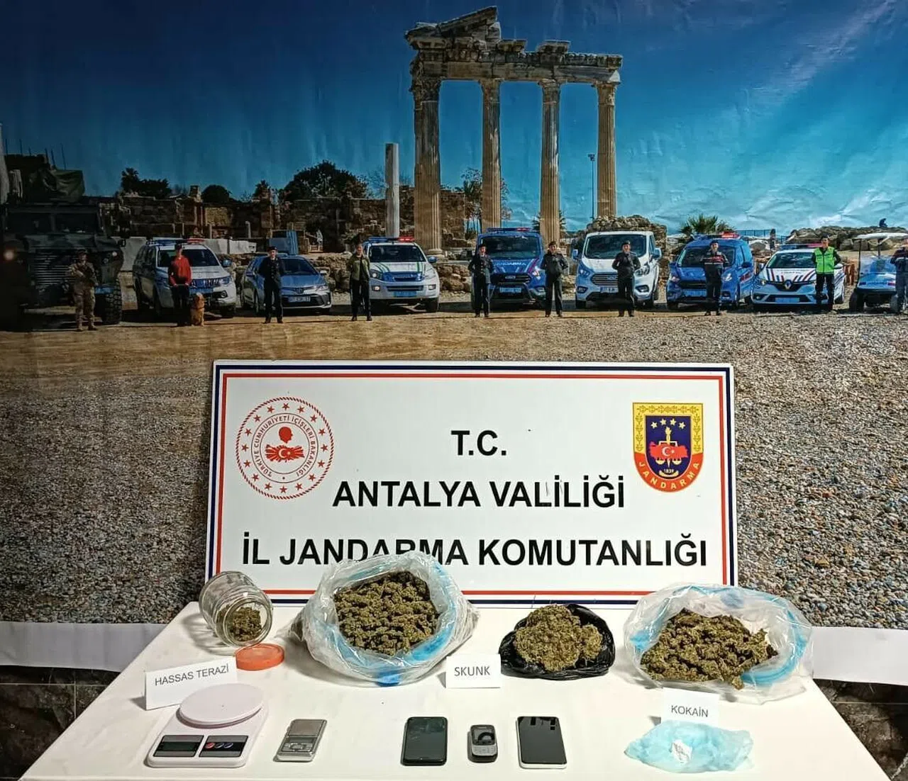 Antalya Valiliği İl Jandarma Komutanlığı, uyuşturucu madde imal ve ticaretine yönelik başarılı çalışmalarına tüm hızıyla devam ediyor. Antalya Cumhuriyet Başsavcılığı talimatları doğrultusunda; uyuşturucu madde imal ve ticaretine yönelik Antalya İl Jandarma Komutanlığına bağlı İstihbarat Şube Müdürlüğü ve Kepez İlçe Jandarma Komutanlığı ekipleri ile yürütülen çalışmalar çerçevesinde; N.D., C.D. ve S.G. isimli şahısların temin ettikleri uyuşturucu maddeyi, Muratpaşa ilçesinde kiraladıkları evden piyasa sürecekleri tespit edildi. Şüphelilerin bulunduğu evde yapılan aramada; 4 kilo 150 gram skunk, 50 gram kokain ve 2 adet hassas terazi ele geçirildi.