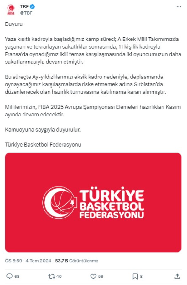 Türkiye Basketbol Federasyonu, A Milli Erkek Basketbol Takımı'nın sakat oyuncuların fazlalığı ve risklerin önlenmesi amacıyla Sırbistan'da düzenlenecek olan hazırlık turnuvasına katılmama kararı aldığını duyurdu. Federasyonun resmi internet sitesinden yapılan açıklamada, yaz döneminde kısıtlı kadroyla başlanan kampta yaşanan ve tekrarlayan sakatlıklar sonucunda takımın eksik kadroyla mücadele ettiği vurgulandı. Fransa'da oynanan ikili temas karşılaşmasında da iki oyuncunun daha sakatlanması üzerine alınan bu kararın, milli takımın deplasmandaki maçlarda riske edilmemesi için yapıldığı belirtildi.