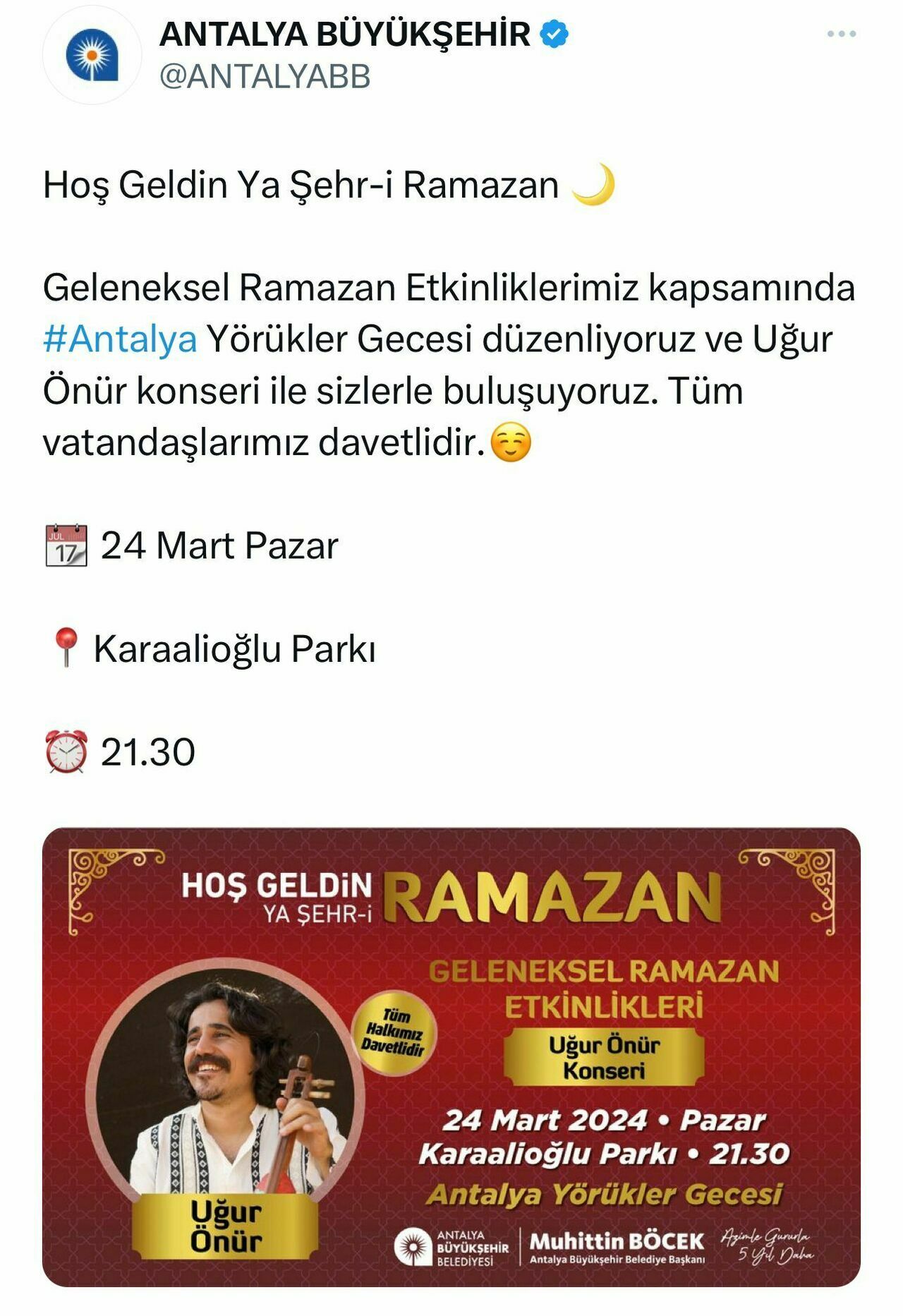 Uğur Önür, Antalya Büyükşehir Belediyesi'nin düzenlediği Ramazan etkinlikleri çerçevesinde 24 Mart Pazar günü Antalya Yörükler Gecesi'nde sahne alacaktı.