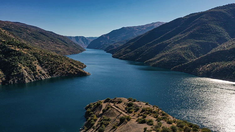Fırat Nehri üzerinde kurulu olan ve Türkiye'nin en büyük ikinci barajı olan Karakaya Baraj Gölü, Elazığ, Diyarbakır ve Malatya illerinin kesiştiği yerde yer alıyor. Doğal güzellikleriyle dikkat çeken bu bölgede, drone ile yapılan çekimlerle bir kez daha gözlerin önüne serildi. Baraj gölünün Elazığ'ın Sivrice ilçesine bağlı Dikmen köyü mevkisinde uzayan bölümü, doğa tutkunlarının ilgisini çeken manzaralar sunuyor.