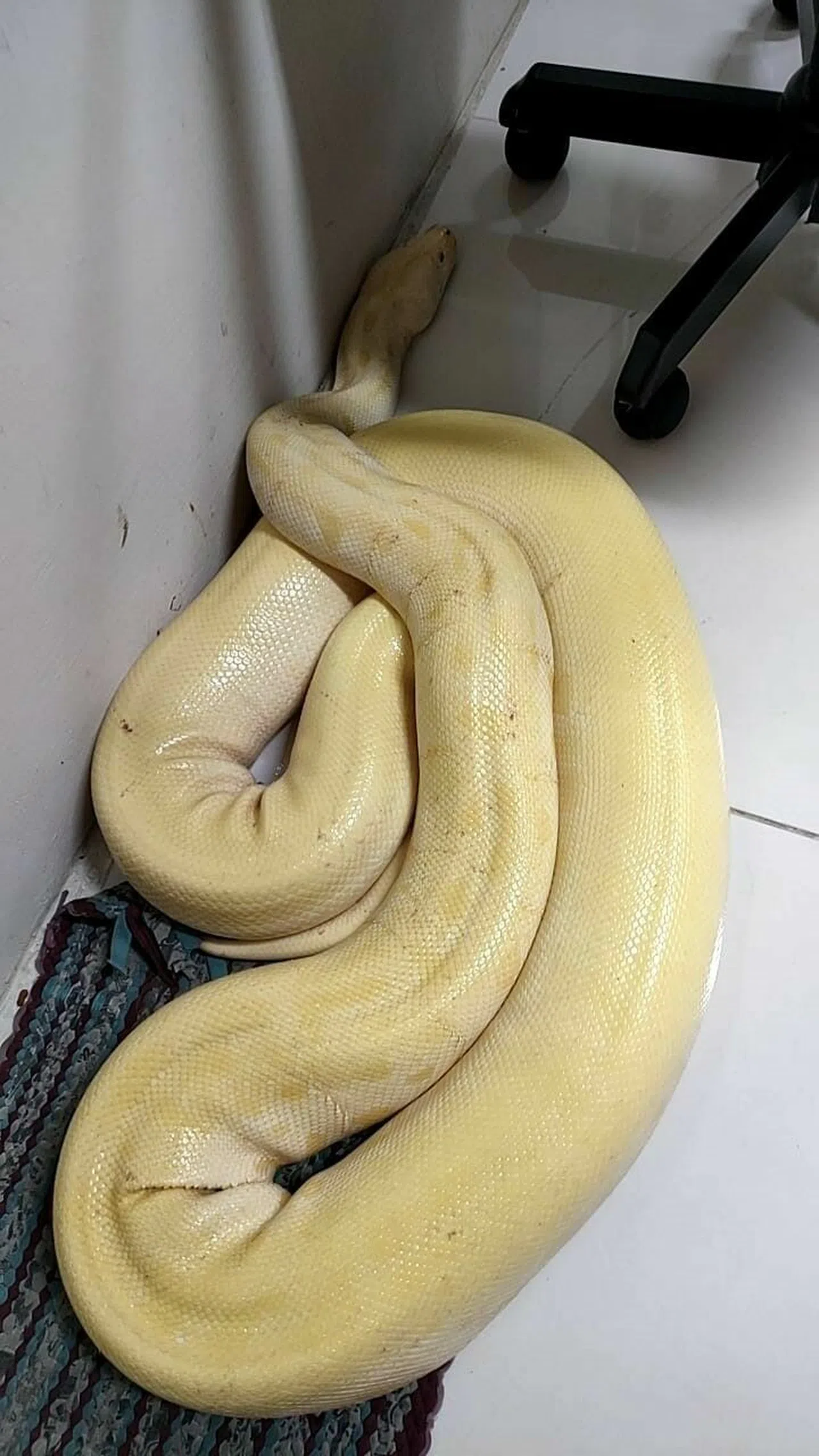 Yılan, itfaiye merkezine getirildi, ancak burada yeterli büyüklükte bir kafes bulunamayınca geceyi ekiplerin odasında geçirdi. Sosyal medya üzerinden yapılan paylaşımlar sayesinde yılanın sahibi, pitonunun güvende olduğunu öğrenerek sabah saatlerinde itfaiye merkezine gelerek evcil yılanını teslim aldı. Albino pitonlar genellikle Afrika'da görülen, pigmentasyon eksikliği nedeniyle beyaz veya sarımsı renkte olan genetik bir mutasyon sonucu ortaya çıkan dev yılan türlerindendir. Olay sonrasında piton ve sahibi sağlık ve güvenlik açısından rahat bir şekilde bir araya getirildi.