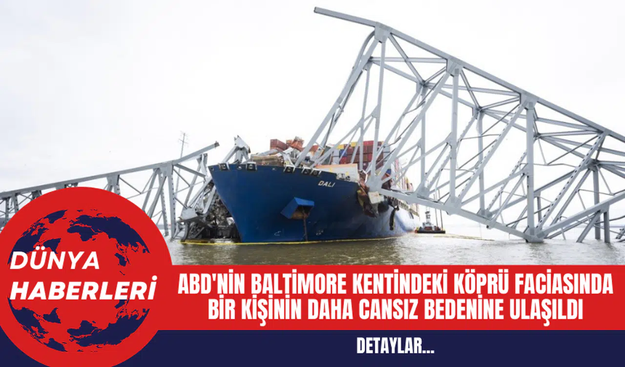 Maryland eyaletine bağlı Baltimore kentinde, 26 Mart'ta yük gemisinin köprüye çarpmasıyla yaşanan olayın ardından, kayıp durumdaki işçilerden birinin daha cansız bedenine ulaşıldığı açıklandı. Şahsın kimliği ailesinin talebi üzerine açıklanmadı.
