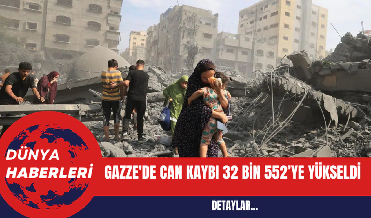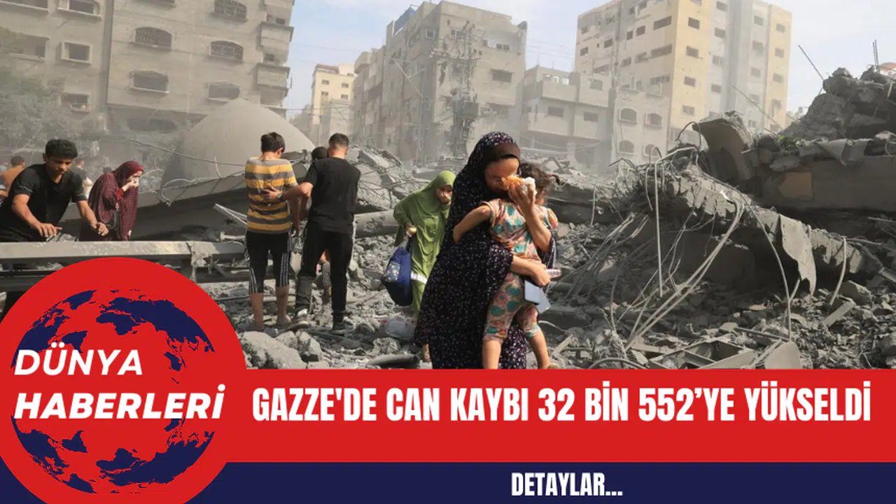 İsrail'in Gazze Şeridi'ne yönelik saldırıları devam ediyor. Son 24 saat içinde gerçekleşen saldırılarda 62 Filistinli daha yaşamını yitirdi. Bu saldırılarla birlikte 7 Ekim'den bu yana toplam can kaybı 32 bin 552'ye ulaştı.