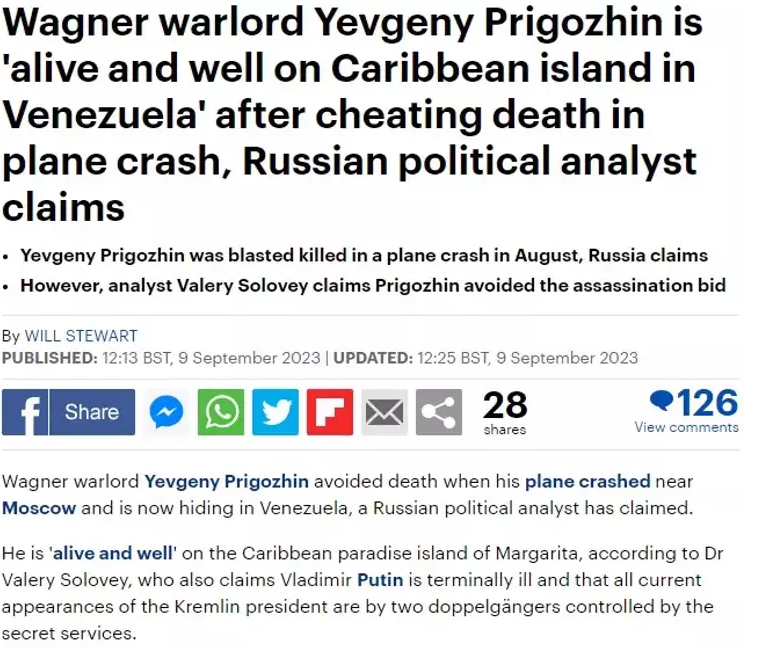 Moskova'nın ajan ve diplomat yetiştiren prestijli okulu, Uluslararası İlişkiler Enstitüsü'nde (MGIMO) eski bir profesör olan Solovey Prigojin'in ölmesinden günler sonra Wagner liderinin hayatta olduğunu, uçakta onun değil dublörünün olduğunu söyleyerek takipçilerine ilerleyen günlerde Prigojin'in yerini açıklayacağının sözünü vermişti.