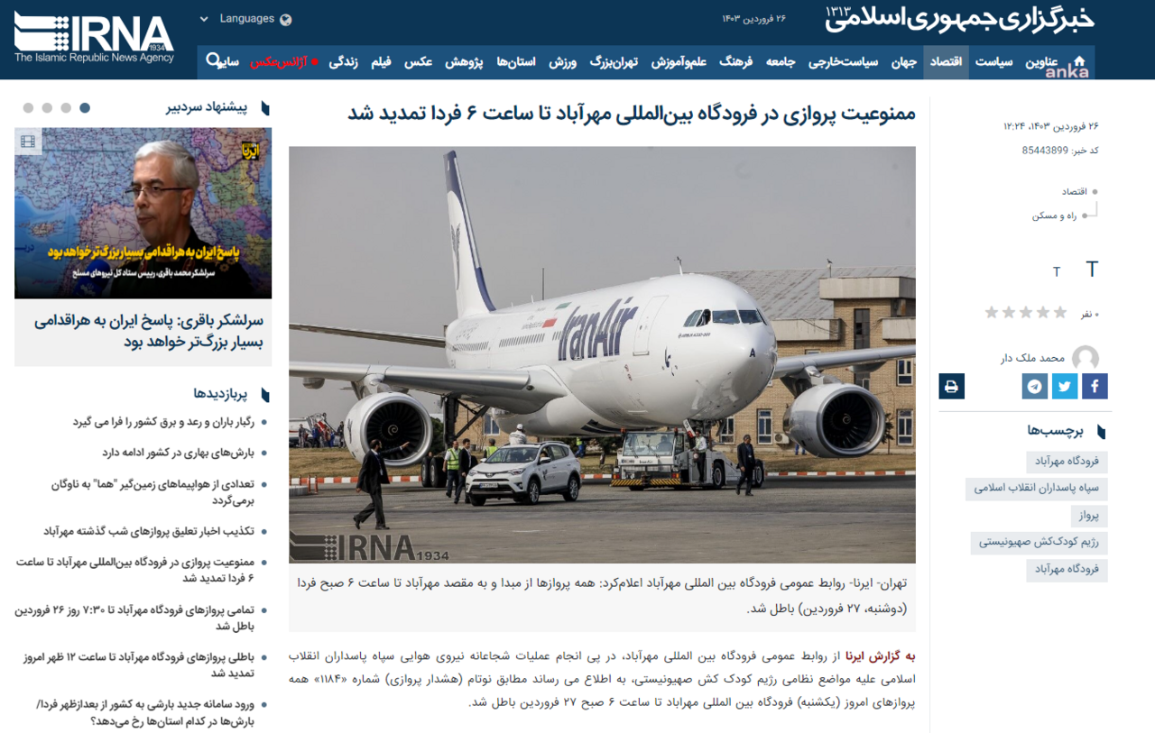 Saldırının ardından İran'da iç hat uçuşları iptal edildi. İran'ın resmi haber ajansı İRNA'nın haberinde, Mihrabad Havalimanı'ndan yapılan yazılı açıklamaya yer verildi. Haberde, "Havalimanından gerçekleşmesi planlanan tüm uçuşlar yarın 06.00'ya kadar iptal edildi" denildi.