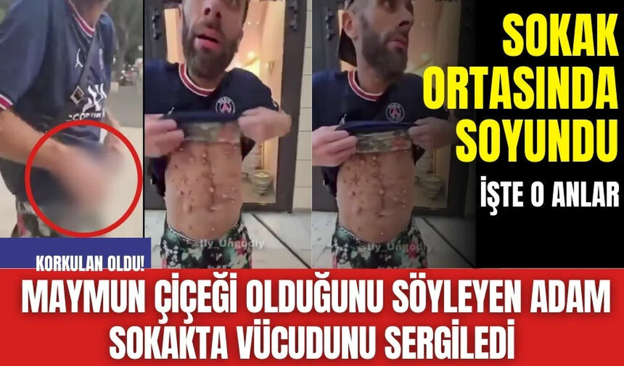Maymun çiçeği olduğunu söyleyen adam sokakta vücudunu sergiledi. Tişörtünü kaldırarak yaralarını gösteren adam çevredeki vatandaşları korkuttu. O anlar amatör kameraya yansıdı.