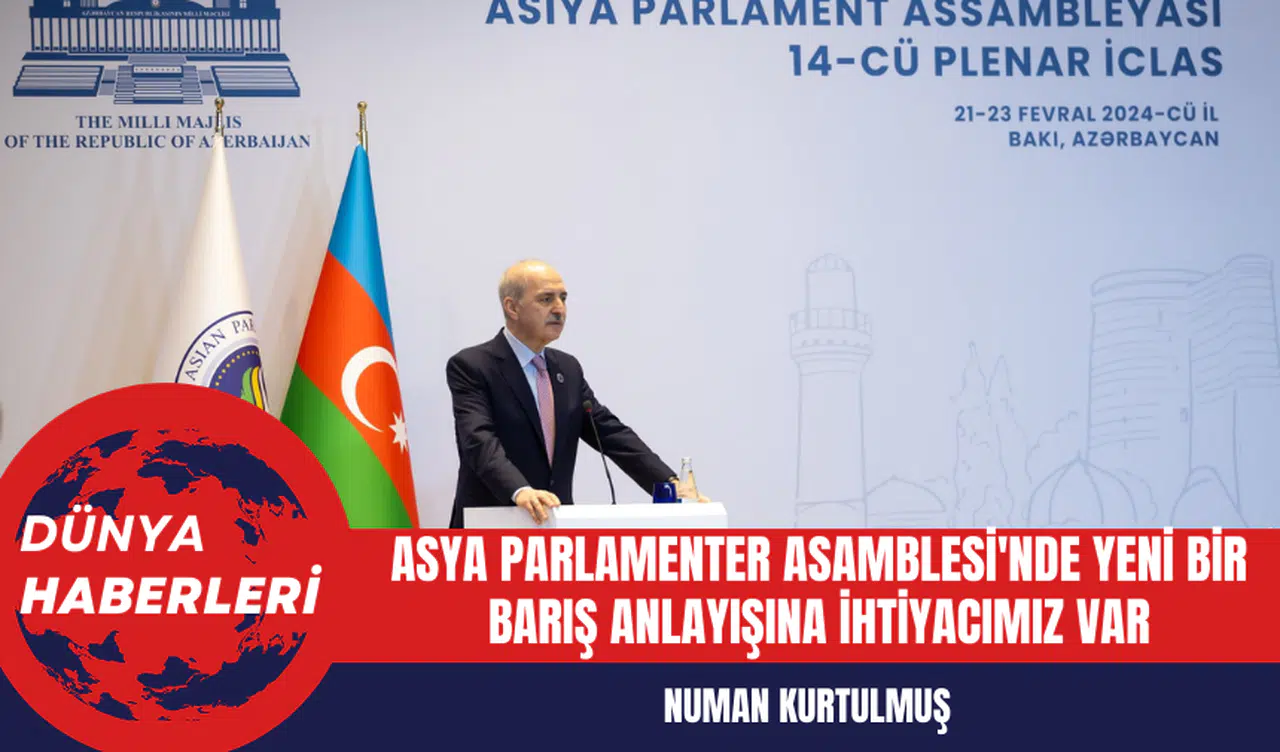 TBMM Başkanı Numan Kurtulmuş, Azerbaycan’da düzenlenen Asya Parlamenter Asamblesi (APA) 14. Genel Kurulu’nda önemli açıklamalarda bulundu. Kurtulmuş, “Yeni bir Birleşmiş Milletler'e, yeni bir küresel barış mekanizmasına ve dünyayı yeniden insanların eşitliği prensibi içerisinde barış çerçevesinde bir araya getirebilecek uluslararası bir anlayışa ihtiyacımız var” dedi.