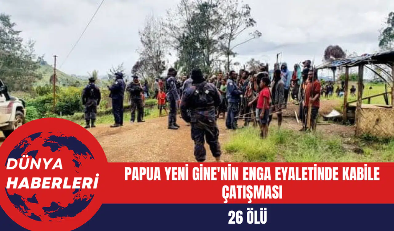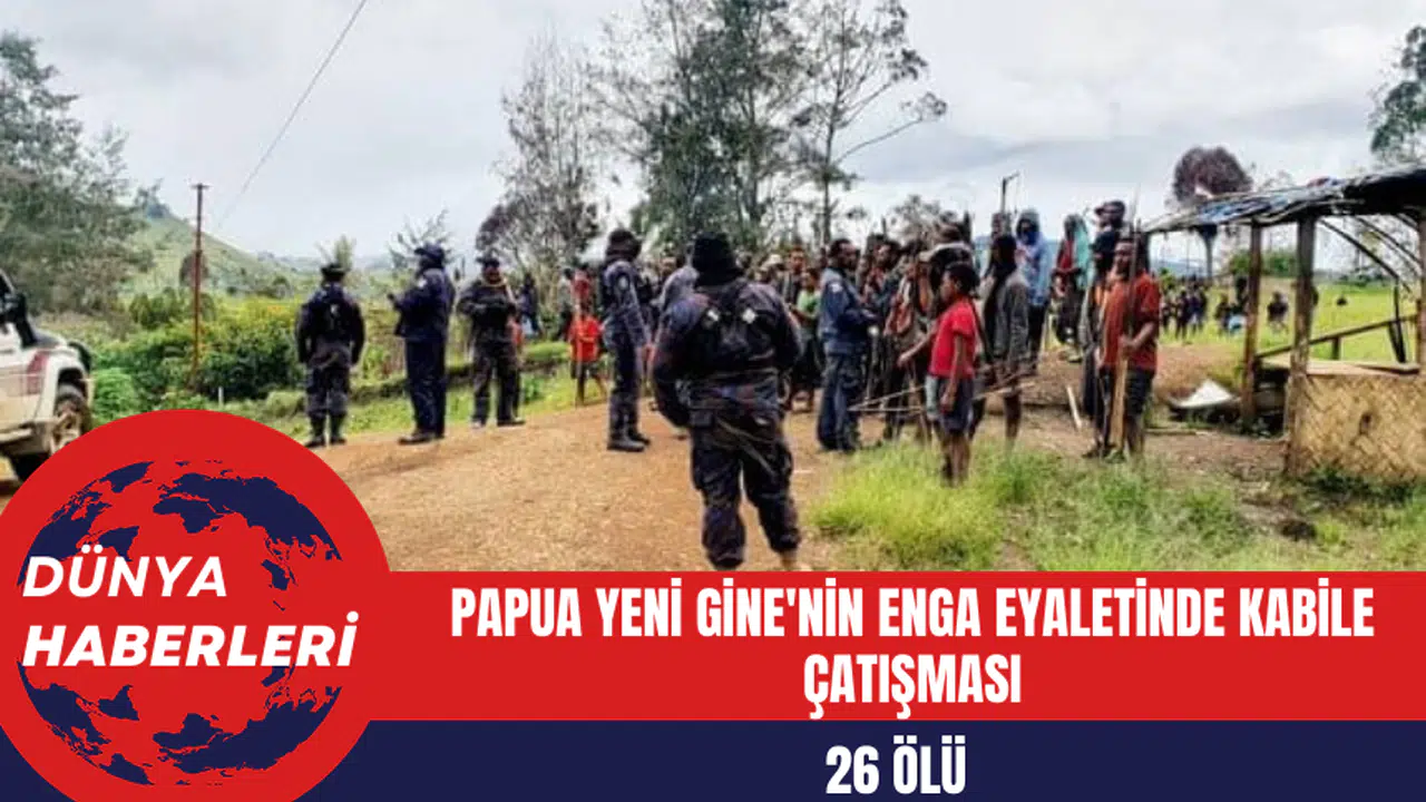 Güney Pasifik ülkesi Papua Yeni Gine'nin kuzeyinde bulunan Enga eyaletinde iki kabilenin arasında çıkan çatışmada en az 26 kişi hayatını kaybetti. Polis yetkilileri, dağlık bölgelerde gerçekleşen çatışmanın detayları hakkında bilgi verdi. Polis Teşkilatı Üst Düzey Yetkilisi George Kakas, çatışmanın bir grubun diğerini pusuya düşürmesiyle gerçekleştiğini belirtti. Kakas, "Kabile üyeleri kırsal kesimde, çalılıklar arasında öldürüldü" dedi.