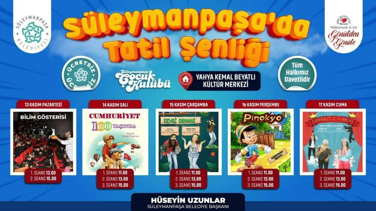 Tekirdağ Süleymanpaşa Belediyesi, öğrencilere yönelik bir tatil etkinliği düzenliyor. 13-17 Kasım tarihleri arasında gerçekleşecek olan Tatil Şenliği, çocukları eğlenceli ve öğretici etkinliklerle buluşturacak. Yahya Kemal Beyatlı Kültür Merkezi'nde düzenlenecek etkinlikler arasında tiyatrolar, bilim gösterileri ve Cumhuriyetimizin 100. Yılı'na özel sahne gösterisi bulunuyor. Başkan Hüseyin Uzunlar, tüm öğrencileri ve ailelerini etkinliklere davet etti, etkinliklerin ücretsiz olduğunu belirtti. Etkinliklerde çocuklara bilim, sanat ve eğlenceyle dolu bir tatil yaşatılması hedefleniyor.