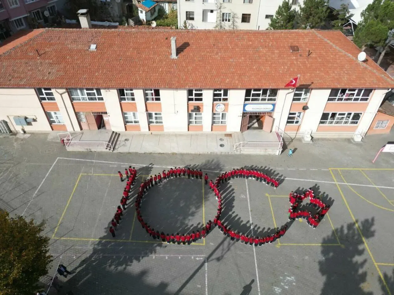 230 öğrenci ve 17 öğretmen, 100. yıl logosunu oluşturmak için okul bahçesine geldi. "100. Yıl" koreografisi, Cumhuriyet Marşı'nın eşliğinde icra edildi ve bu gösteri dronlarla havadan kaydedildi.