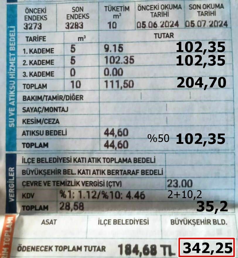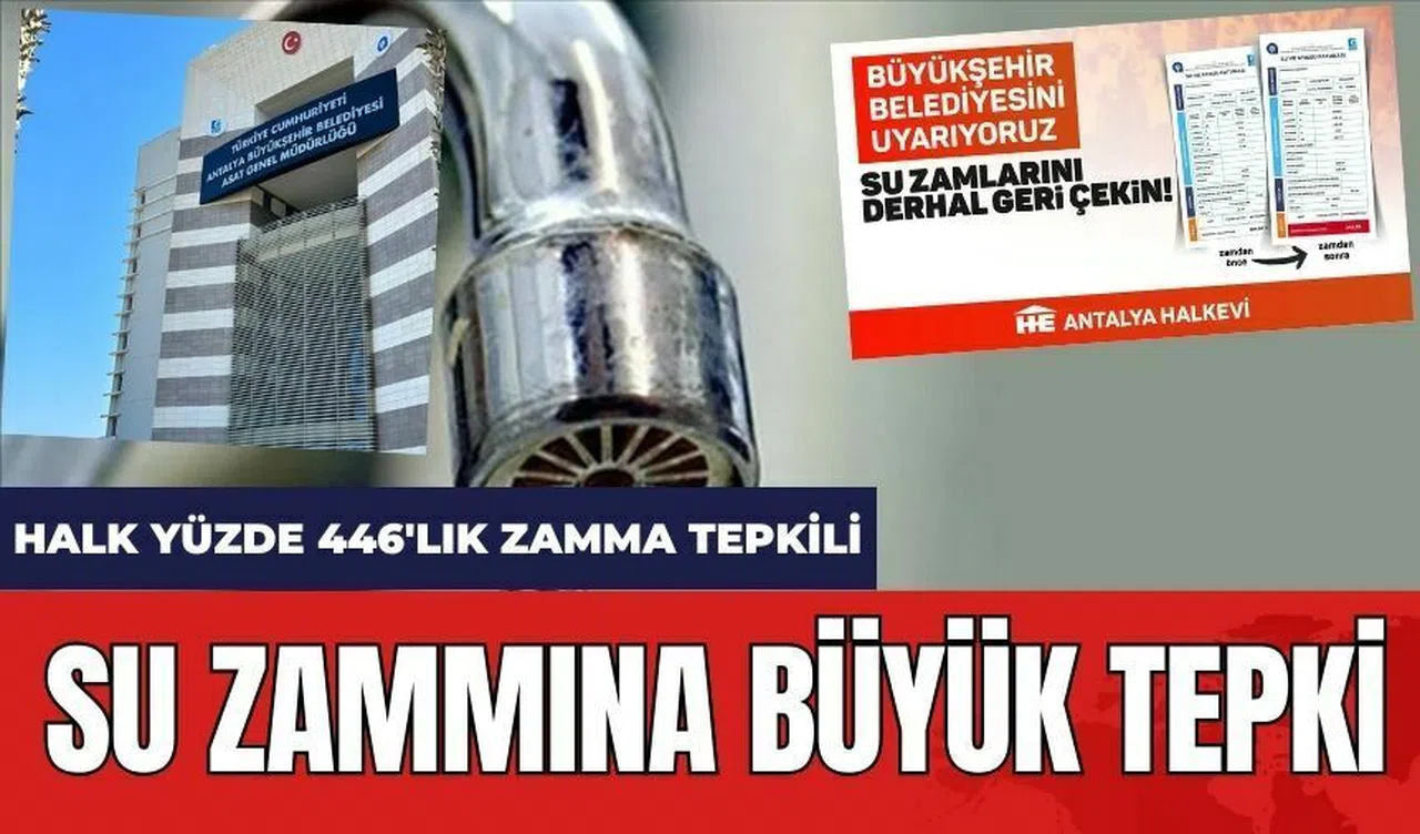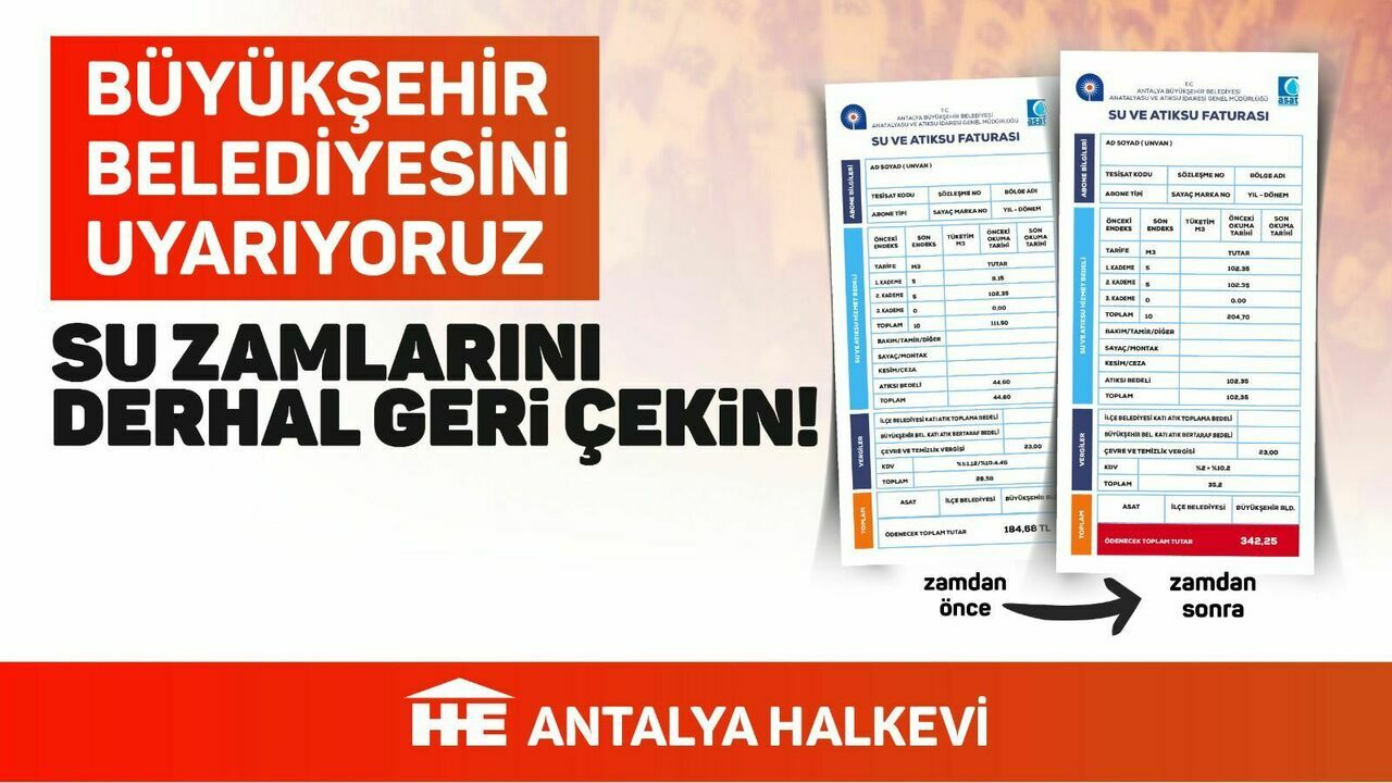 Antalya Su ve Atıksu İdaresi (ASAT) Genel Müdürlüğü Olağanüstü Genel Genel Kurulu'nda CHP’nin ve DP’nin oyları ile kabul edilen yüzde 446’lık zam ile 5 tona kadar ton başı 1.83 TL olan fiyat 10 TL’ye çıkarıldı. Konuyla ilgili Akdeniz Gerçek’e konuşan Antalya Büyükşehir Belediyesi personellerinden alınan bilgiye göre yarın zammın düşürülmesi ile ilgili yönetim toplanacak. Antalya Halkevi tarafından yapılan açıklamada, “Kentdaşımıza gelen temmuz ayı faturası üzerinden Antalya halkının nasıl fahiş bir fiyat artışına maruz kaldığını örnekledik. Bu yurttaşımız ağustos ayında % 83,52 zamlı olarak faturasını ödeyecektir. Hane büyüklükleri ve su tüketim oranları, Antalyalıların, hane büyüklüklerine göre çoğunlukla 300 ila 1000 TL arasında değişen miktarlarda su parası ödeyeceğini göstermektedir. Özellikle kentin en yoksulu ve kalabalık ailelerden oluşan Kepez ilçesi bu zamlardan en çok etkilenecek bölgedir. Yoksullar için indirimli su diye sunulan ve 1,83 TL’den 10 TL’ye çıkarılarak yüzde 446 zam yapılan ayda 5 m3 su harcaması ise yalnız yaşayan kişiler için belki mümkün olabilir. 2 milyon 700 bin nüfuslu Antalya’da sadece yalnız yaşayan 195 bin kişiyi ilgilendirmektedir” denildi.