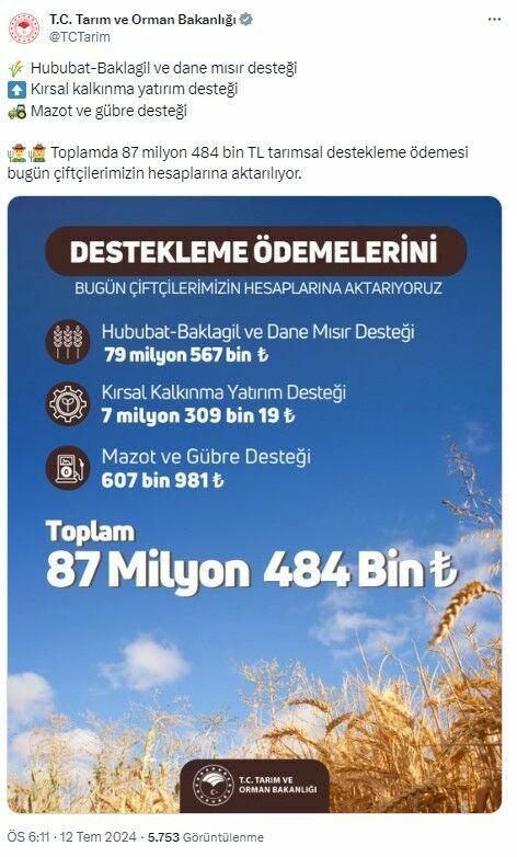Bakan Yumaklı’nın sosyal medya hesabından yaptığı açıklamaya göre, toplamda 87 milyon 484 bin TL’lik destek ödemeleri bugün çiftçilerin hesaplarına aktarıldı. Bu gelişme, tarımsal üretimin desteklenmesi ve kırsal kalkınmanın teşvik edilmesi açısından büyük bir önem taşıyor.