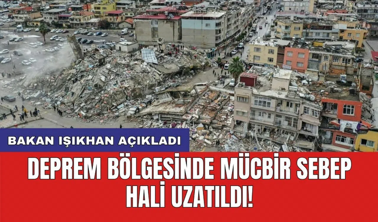 Bakan Işıkhan, sosyal medya hesabından yaptığı açıklamada, 6 Şubat depremlerinden etkilenen illerde yaşayan vatandaşlara desteklerin sürdürüldüğünü belirterek, "Adıyaman, Hatay, Kahramanmaraş ve Malatya illeri ile Gaziantep ili İslahiye ve Nurdağı ilçelerinde 30 Nisan 2024 itibarıyla sona erecek olan mücbir sebep halini 31 Ağustos 2024 tarihine kadar uzatıyoruz" dedi.
