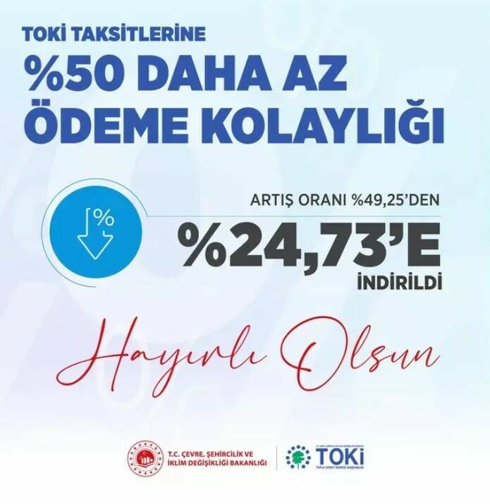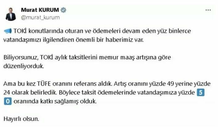 Çevre, Şehircilik ve İklim Değişikliği Bakanı Murat Kurum, sosyal medya hesabından yaptığı açıklamada, Toplu Konut İdaresi (TOKİ) tarafından yapılan aylık ödemelere dair önemli değişiklikler hakkında bilgi verdi. Bakan Kurum, TOKİ aylık taksit ödemelerinde artık memur maaş artış oranı yerine Tüketici Fiyat Endeksi'ni (TÜFE) referans aldıklarını belirtti.