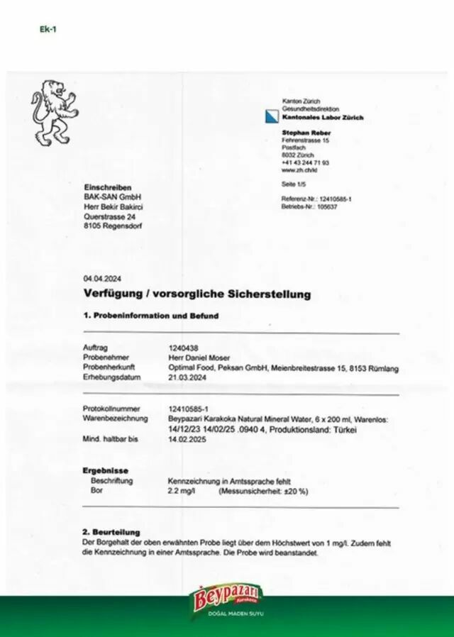 İsviçre Federal Gıda Güvenliği ve Veterinerlik Bürosu (FSVO), Türkiye'den ithal edilen Beypazarı maden suyunda yüksek miktarda bor tespit ettiğini açıkladı ve bu nedenle ürünün satışını ülkesinde yasakladı. Haberin ardından Beypazarı yetkililerinden bir açıklama geldi.
