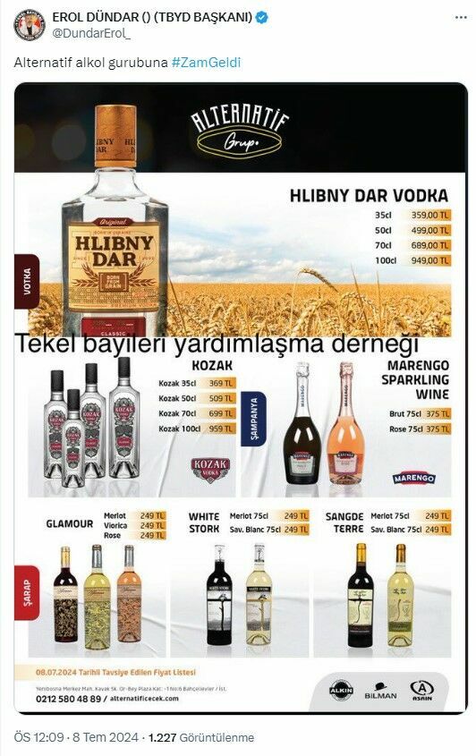 Tekel Bayileri Yardımlaşma Derneği Başkanı Erol Dündar, X hesabından yaptığı paylaşımda alternatif alkol gruplarına zam yapıldığını duyurdu.