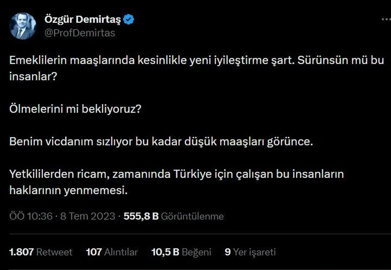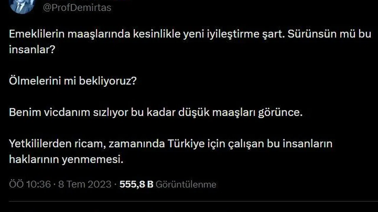 Bu belirsizliğe bir yorumda Özgür Demirtaş’tan geldi. Demirtaş sosyal medya hesabından, “Emeklilerin maaşlarında kesinlikle yeni iyileştirme şart. Sürünsün mü bu insanlar? Ölmelerini mi bekliyoruz? Benim vicdanım sızlıyor bu kadar düşük maaşları görünce. Yetkililerden ricam, zamanında Türkiye için çalışan bu insanların haklarının yenmemesi." Paylaşımını yaptı.