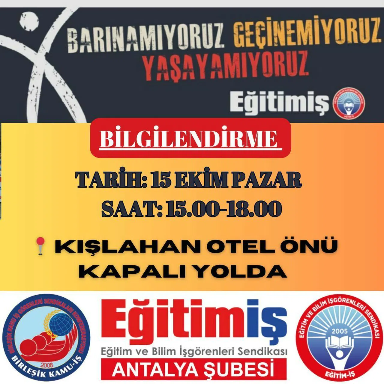 Kapalıyol'da Kışlahan Otel önünde saat 15.00-18.00 saatleri arasında stant ve çadır kuracak Eğitim İş Antalya Şubesi, herkesi dayanışmaya davet etti. Eğitim İş'te eş zamanlı yapılacak etkinlik sonrası aynı gün akşam 20.00’de sosyal medya etkinliği yapılacak.