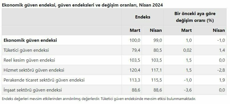 Türkiye İstatistik Kurumu (TÜİK), son verilerine göre, Nisan ayında ekonomik güven endeksinin Mart ayına göre %1,0 oranında azalarak 99,0 değerine düştüğünü açıkladı.