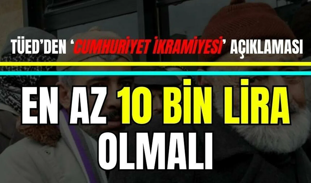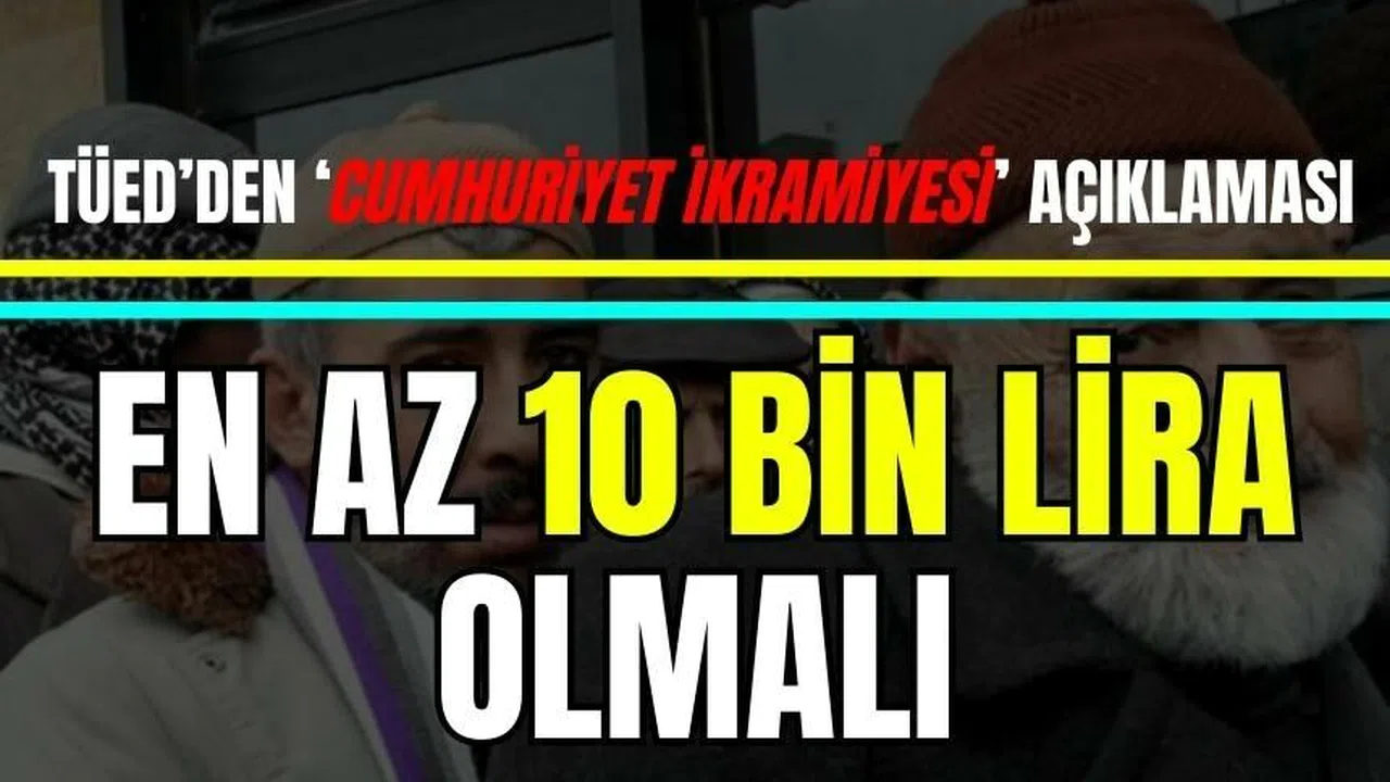 Türkiye Emekliler Derneği (TÜED) Genel Başkanı Kazım Ergün, emeklilere verileceği konuşulan "Cumhuriyet İkramiyesi"nin en az 10 bin lira düzeyinde olması gerektiğini kaydetti.