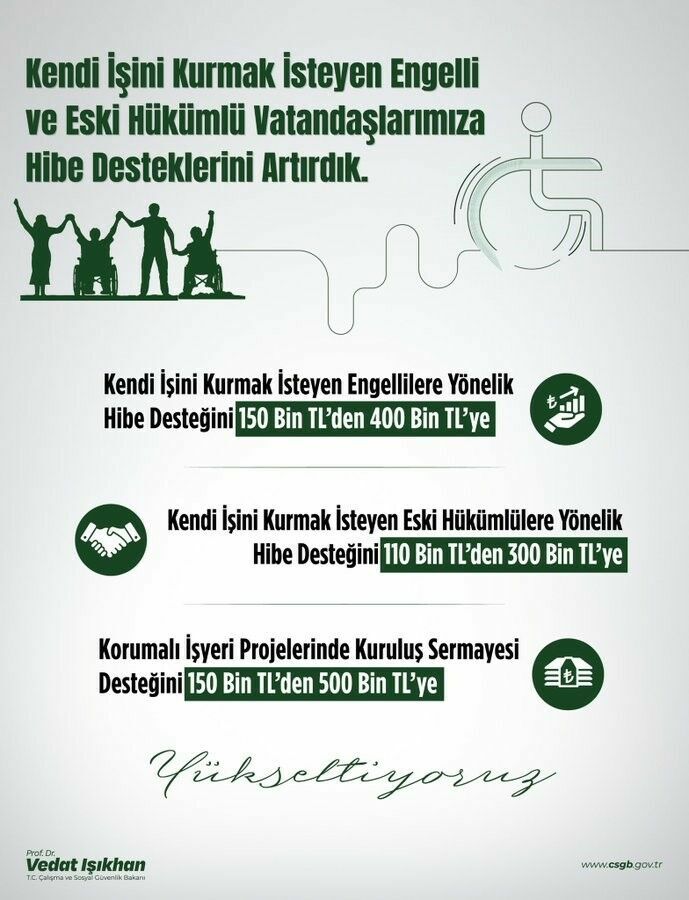 Işıkhan, engelli ve eski hükümlü vatandaşlara sağlanan hibe desteği miktarını artırarak iş kurmak isteyenlere önemli bir destek sağlandığını belirtti. Engelli vatandaşların kendi işlerini kurmaları için sağlanan kuruluş işlemleri, işletme gideri ve kuruluş (demirbaş) desteği giderlerini kapsayan hibe desteği miktarının 150 bin TL’den 400 bin liraya; eski hükümlü vatandaşların da kendi işlerini kurabilmeleri ve istihdam edilebilmesi için verilen hibe miktarının ise 110 bin liradan 300 bin liraya yükseltildiğini duyurdu.
