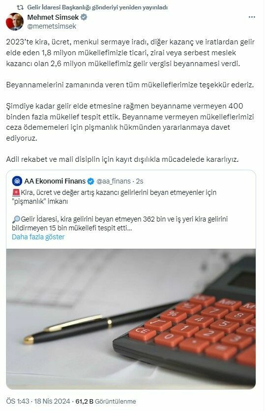 GİB, kira, ücret gibi gelirler için beyanname veren 1,8 milyon mükellefin yanı sıra ticari, zirai veya serbest meslek kazancı için bildirimde bulunan 2,6 milyon mükellefe SMS göndererek, beyannamelerini zamanında verdiği için teşekkür etti.