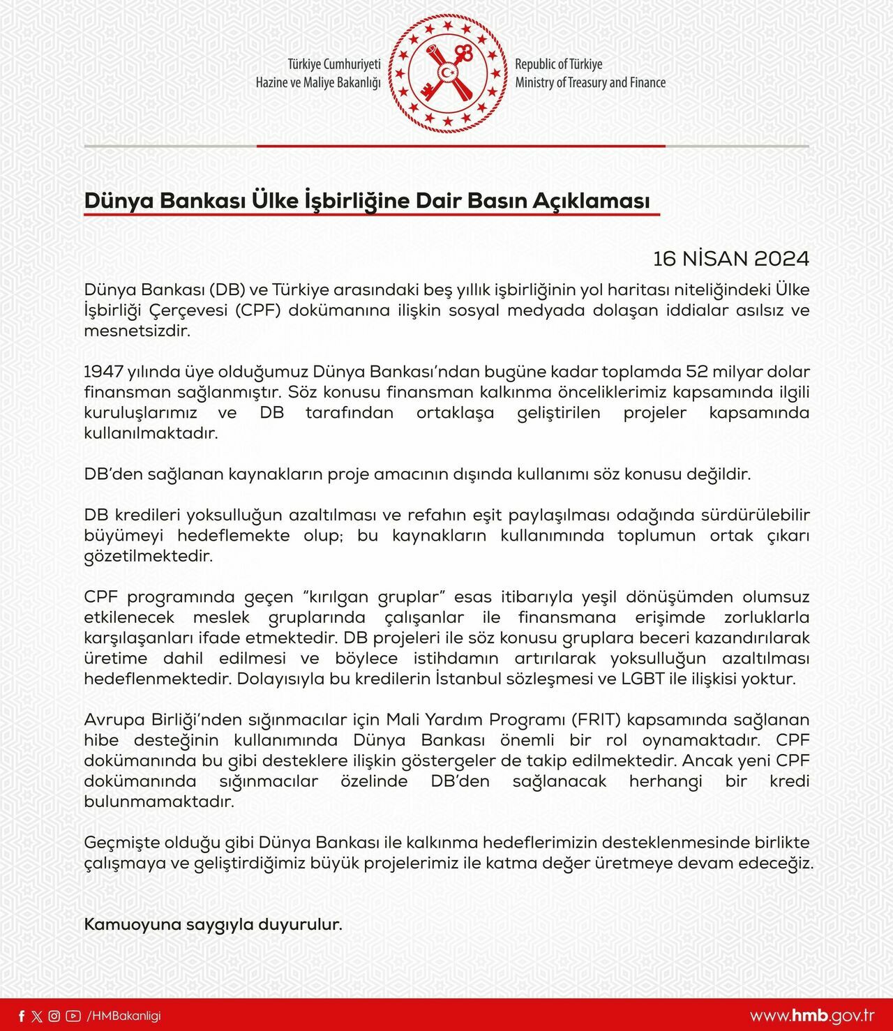 Hazine ve Maliye Bakanlığı, Dünya Bankası ve Türkiye arasındaki iş birliğine yönelik CPF dokümanına dair sosyal medyada dolaşan iddialara ilişkin bir yazılı açıklama yaptı. Açıklamada, bu iddiaların asılsız ve mesnetsiz olduğu belirtildi. Türkiye’nin 1947 yılında Dünya Bankası'na üye olduğunun hatırlatıldığı açıklamada, "Dünya Bankası'ndan bugüne kadar toplamda 52 milyar dolar finansman sağlanmıştır. Söz konusu finansman, kalkınma önceliklerimiz doğrultusunda ilgili kuruluşlarımız ve DB tarafından ortaklaşa geliştirilen projelerde kullanılmaktadır" denildi.