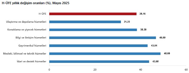 H-ÜFE, Mayıs 2025 döneminde bir önceki aya göre yüzde 2,37 yükseldi. Yılbaşından bu yana artış oranı yüzde 21,42’ye ulaştı. Geçen yılın aynı ayına kıyasla endeks yüzde 38,16 arttı. On iki aylık ortalamalara göre hesaplanan yıllık artış oranı ise yüzde 48,65 olarak açıklandı.