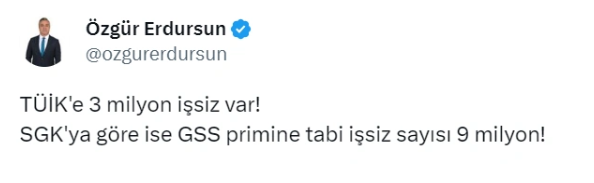 TÜİK'in işsizlik rakamlarına ilişkin verileri yayımlaması sonrası sosyal medya hesabından paylaşım yapan SGK Uzmanı Özgür Erdursun, TÜİK'e 3 milyon işsiz var! SGK'ya göre ise GSS primine tabi işsiz sayısı 9 milyon" diye ifade etti.