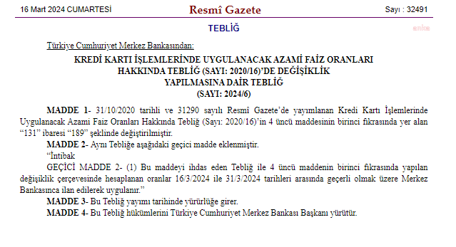 Merkez Bankası'nın aldığı kararlar, kredi kartı işlemlerinde uygulanacak azami faiz oranları hakkında yapılan değişiklikleri içermektedir. Bu değişiklikler, Resmi Gazete'de yayımlanarak yürürlüğe girdi. Yapılan güncellemelerle birlikte, kredi kartlarından nakit avans işlemleri ve kredili mevduat hesaplarında uygulanacak aylık azami faiz oranları artırıldı. Özellikle, nakit çekim işlemlerinde uygulanacak faiz oranları, ihtiyaç kredisi faiz oranıyla uyumlu hale getirilmiştir.