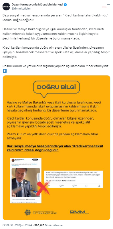 Hazine ve Maliye Bakanı Mehmet Şimşek, sosyal medya hesabından yapılan "kredi kartına taksit kaldırıldı” iddiaları hakkında açıklamalarda bulundu. Şimşek, piyasalarda tedirginlik ve güvensizlik oluşturmaya yönelik kasıtlı haberlerin dolaşıma sokulduğunu vurgulayarak, “Orta Vadeli Programımızda uygulayacağımız politikaları net bir şekilde ortaya koyduk. Kurala dayalı ve öngörülebilir politikalarımız seçim sonrası dönemde de aynen devam edecektir. Bu çerçevede vatandaşlarımızdan istirham ediyorum; lütfen bizden duymadığınız hiçbir habere itibar etmeyiniz" dedi.
