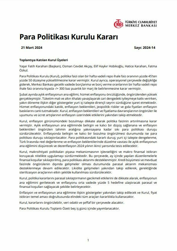 Merkez Bankası, Para Politikası Kurulu toplantısında alınan kararları açıkladı. Kurul, politika faizi olan bir hafta vadeli repo ihale faiz oranını yüzde 45'ten yüzde 50'ye yükseltme kararı aldı. Ayrıca, operasyonel çerçevede değişikliğe giderek, Merkez Bankası gecelik vadede borçlanma ve borç verme oranlarını bir hafta vadeli repo ihale faiz oranına kıyasla -/+ 300 baz puanlık bir marj ile belirleme kararı aldı.