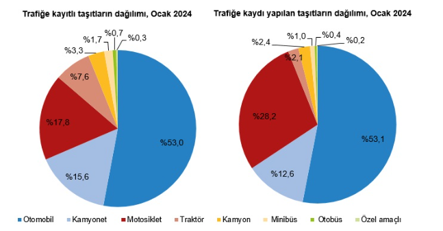 Ocak ayında, Türkiye'de toplam 213 bin 493 adet taşıtın trafiğe kaydı yapıldı. Bu kayıtların dağılımına bakıldığında, otomobiller %53,1'lik bir oranla en büyük paya sahipken, motosiklet %28,2'lik payıyla ikinci sırada yer aldı. Kamyonetler %12,6'lık bir oranla üçüncü sırada gelirken, kamyonlar, traktörler, minibüsler, otobüsler ve özel amaçlı taşıtlar sırasıyla %2,4, %2,1, %1,0, %0,4 ve %0,2 oranlarında kaydedildi.