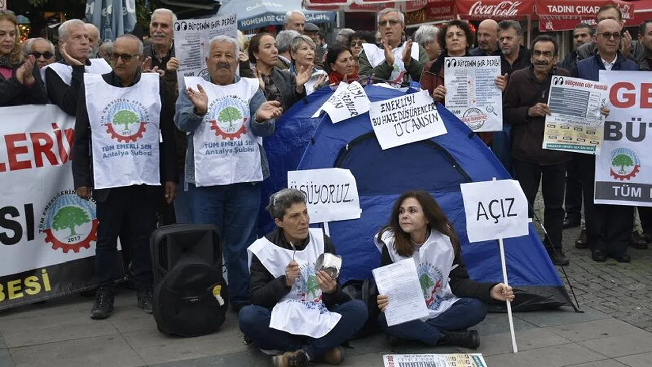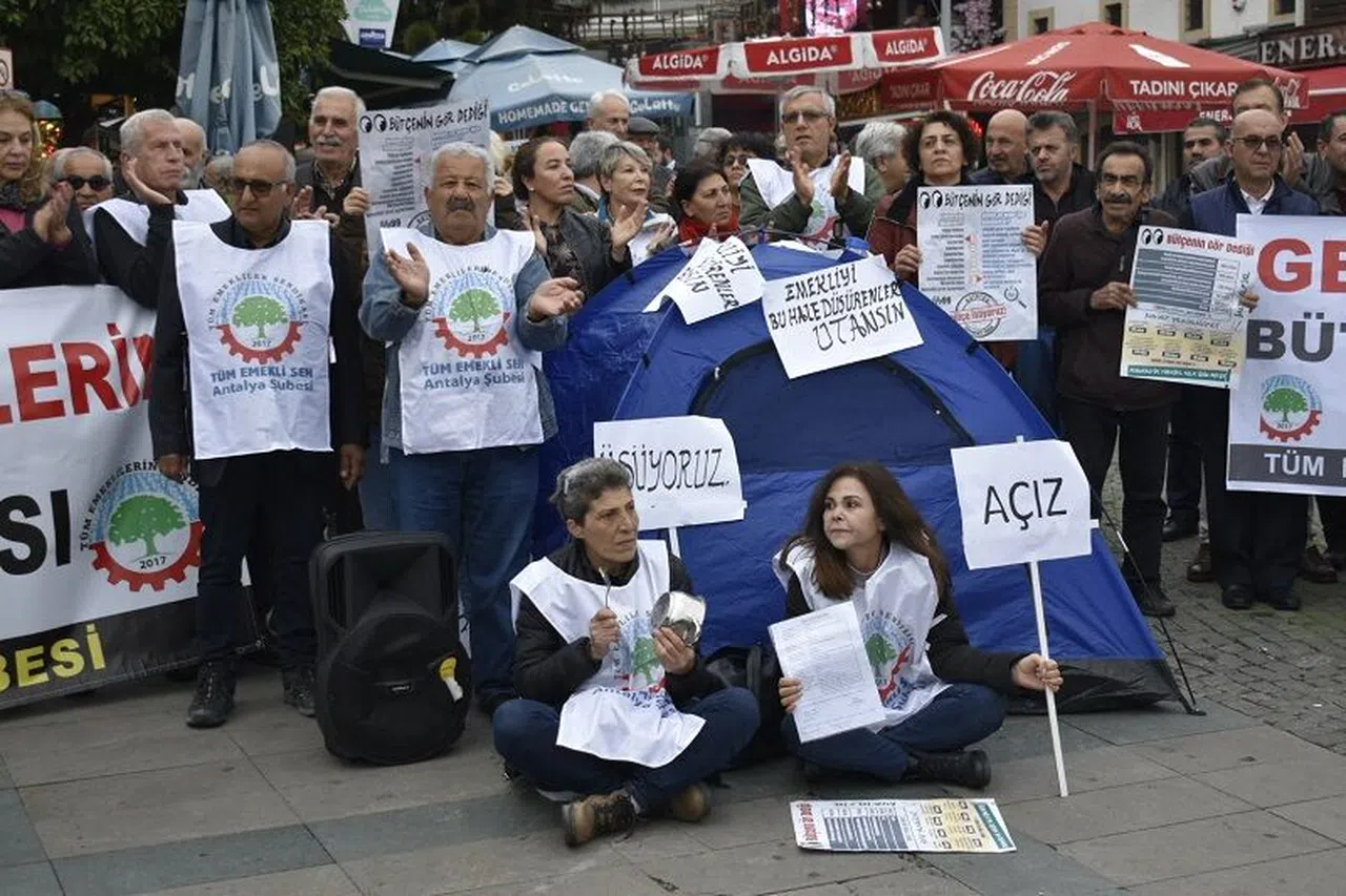 “Zamlar geri alınsın” diyen ve 13 Aralık Salı günü saat 13.00’te Attalos Heykeli önünde çadır kuran emekliler, “2023 yılı bütçesinde yine emekliler yok. Elektriğe, doğalgaza, akaryakıta ve temel gıdaya yapılan fahiş zamlar hayatımızı çekilmez hale getirdi. En düşük emekli maaşı açlık sınırının üzerine çıkarılsın” diyerek alanlarda isyan bayrağını çekti. Eyleme, Tüm Emeklilerin Sendikası Genel Başkanı Zeynel Abidin Ergen, Eğitim-Sen Antalya Şube Başkanı Nurettin Sönmez, SOL Parti Antalya İl Başkanı Aysel Aydın, Emek Partisi Antalya İl Başkanı Hasan Alkan, Parti temsilcileri, emekliler ve çok sayıda vatandaş katıldı. Emekliler adına basın açıklamasını okuyan Tüm Emeklilerin Sendikası Antalya Şube Başkanı Bilge Torosoğlu “Kasım ayı verilerine göre yoksulluk sınırının 25 bin 365 TL, açlık sınırının, 7 bin 786 TL olduğu ülkemizde bugün en düşük emekli maaşı 3 bin 500 TL. Yani açlık sınırının yarısından bile az. Yani ölüm sınırı artık. Ve iki milyondan fazla emekli bu maaşı alıyor. Aynı zamanda açlık sınırının çok altında maaş alan yaklaşık sekiz milyon emekli var. Bu durum emeklilerin açlık ve sefalet içinde yaşadığının açık göstergesidir” dedi.