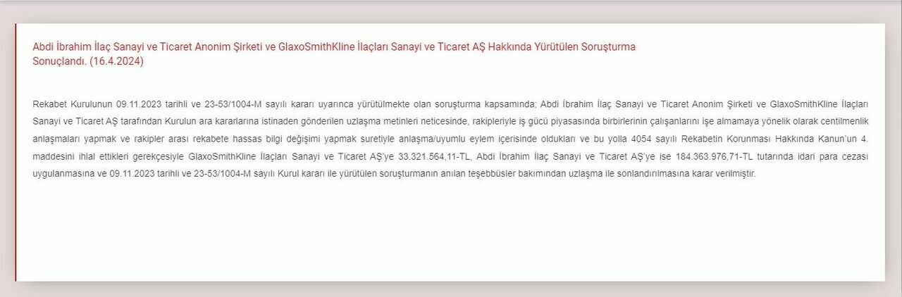 Rekabet Kurumu'nun resmi internet sitesinde yapılan açıklamaya göre, Rekabet Kurulu'nun yürüttüğü soruşturma kapsamında GlaxoSmithKline İlaçları Sanayi ve Ticaret AŞ ile Abdi İbrahim İlaç Sanayi ve Ticaret AŞ'ye yüksek miktarlarda idari para cezası verildiği bildirildi.