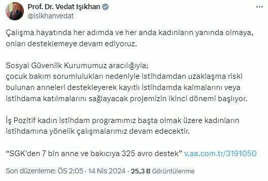 "Sosyal Güvenlik Kurumumuz aracılığıyla çocuk bakım sorumlulukları nedeniyle istihdamdan uzaklaşma riski bulunan anneleri destekleyerek kayıtlı istihdamda kalmalarını veya istihdama katılmalarını sağlayacak projemizin ikinci dönemi başlıyor. İş Pozitif kadın istihdam programımız başta olmak üzere kadınların istihdamına yönelik çalışmalarımız devam edecektir. SGK'den 7 bin anne ve bakıcıya 325 avro destek."