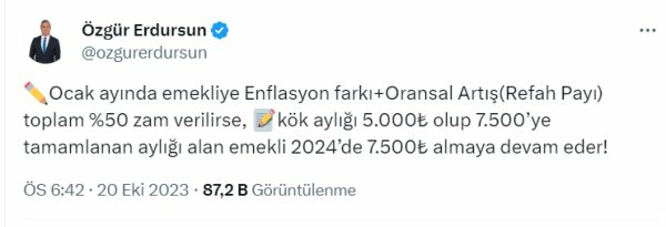 Erdursun, emekli aylıklarına enflasyon farkı ve oransal artış (refah payı) olarak toplamda yüzde 50 zam yapılması durumunda, temel aylığı 5.000 TL olan ve 7.500 TL’ye yükseltilen aylığı alan emeklinin 2024 yılında da 7.500 TL almayı sürdüreceğini belirtti.