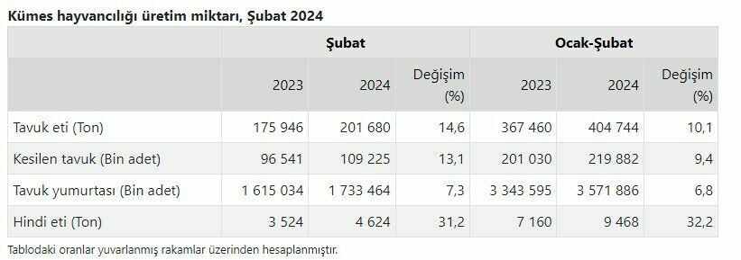 Şubat 2024'te tavuk eti, tavuk yumurtası, kesilen tavuk ve hindi eti üretim miktarlarına dair detaylı veriler aşağıdaki tabloda yer alıyor: