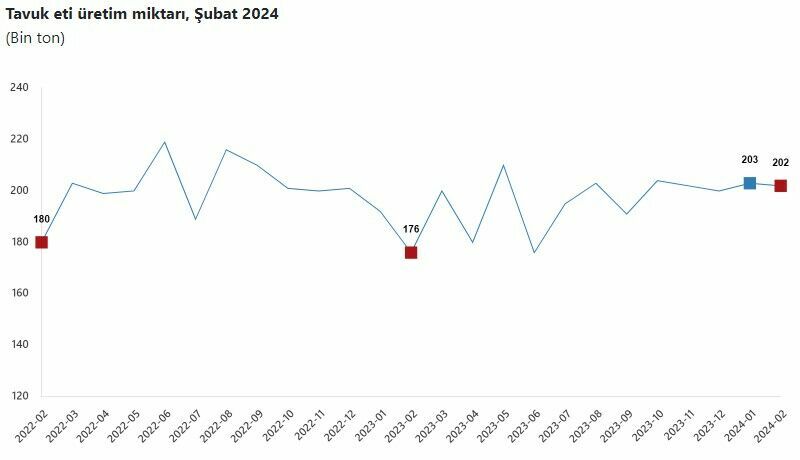 Şubat ayında tavuk eti üretimi 201 bin 680 ton olarak gerçekleşti. Tavuk yumurtası üretimi ise 1,73 milyar adet olarak kaydedildi.