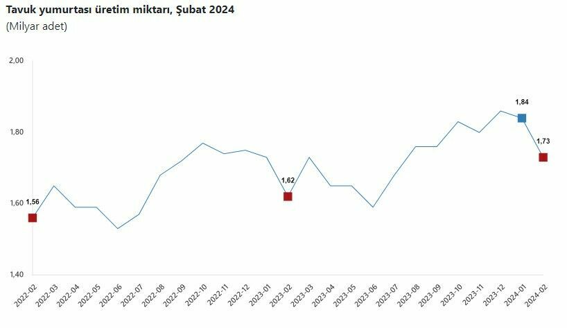 Ocak-Şubat döneminde geçen yılın aynı sürecine göre, tavuk yumurtası üretiminde %6,8 artış gözlendi. Kesilen tavuk sayısında ise %9,4 artış yaşandı. Tavuk eti üretiminde %10,1 artış kaydedilirken, hindi eti üretiminde %32,2'lik bir artış gözlendi.