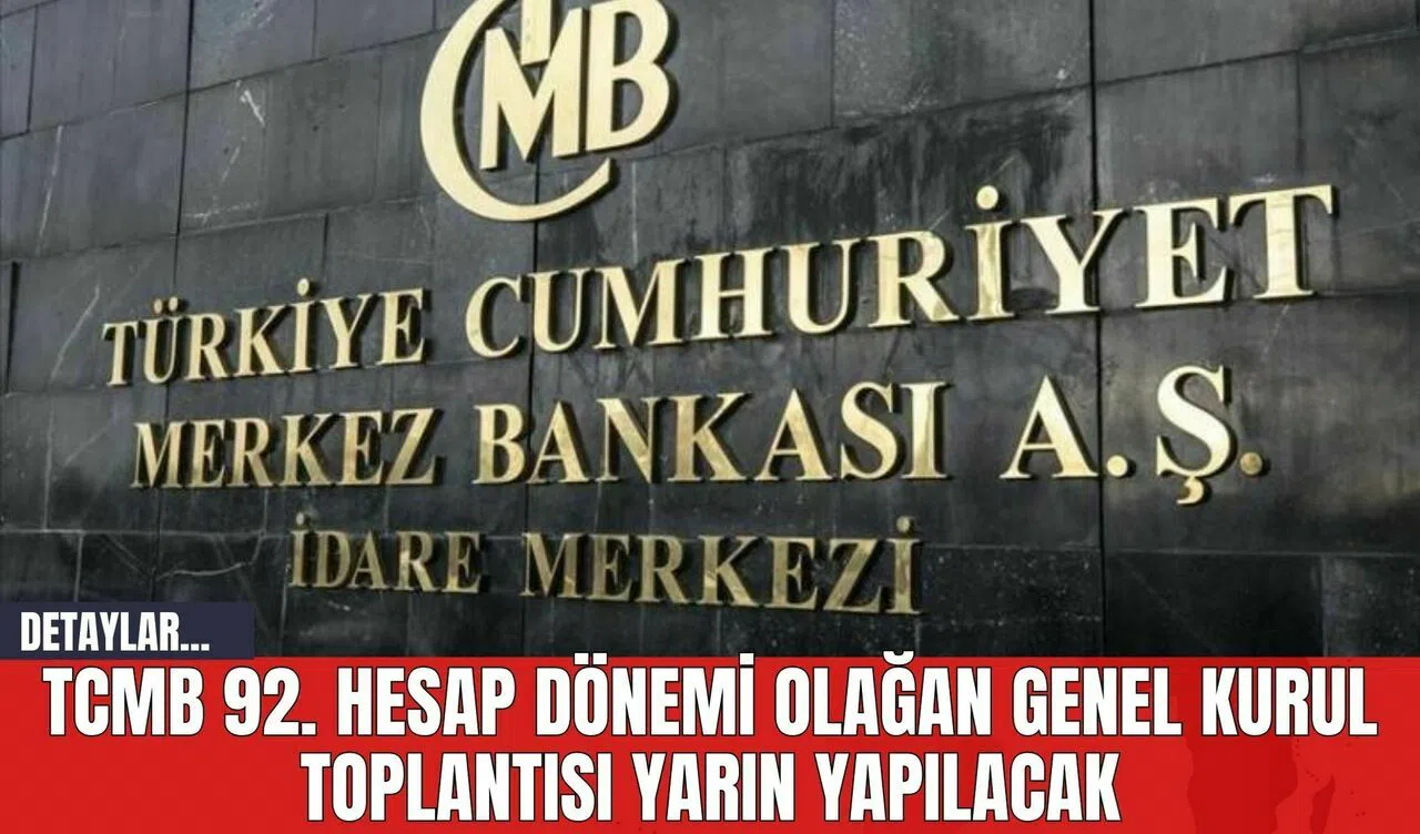 Türkiye Cumhuriyet Merkez Bankası (TCMB) 92. Hesap Dönemi Olağan Genel Kurul toplantısı için geri sayım başladı. Toplantı, yarın saat 14.00'te hem elektronik ortamda hem de fiziki olarak İdare Merkezi Konferans Salonu'nda gerçekleştirilecek. Bu önemli toplantıda, bankanın geçmiş dönem performansı değerlendirilecek ve gelecek stratejileri tartışılacak.