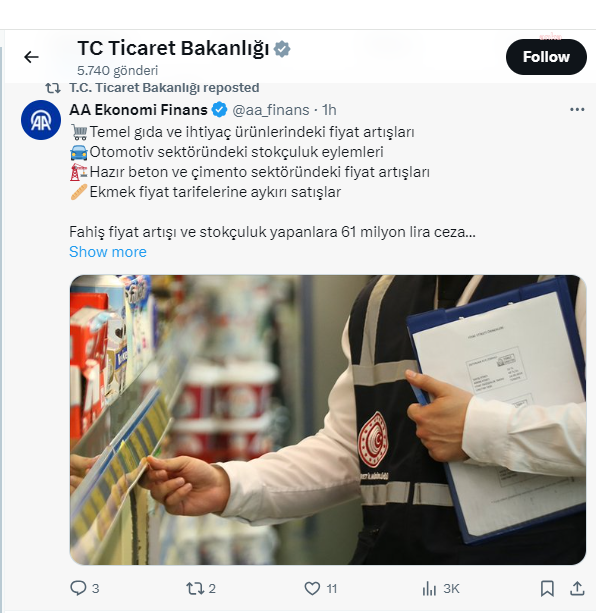 Ticaret Bakanlığı, sosyal medya hesabı üzerinden yaptığı açıklamada, Haksız Fiyat Değerlendirme Kurulu'nun fahiş fiyat artışı ve stokçuluk yaptığı tespit edilen işletmelere toplamda 61 milyon lira idari para cezası uygulandığını duyurdu.