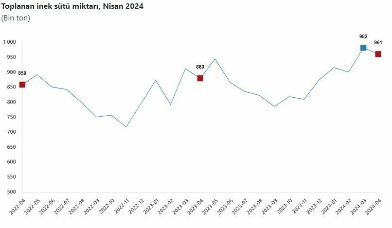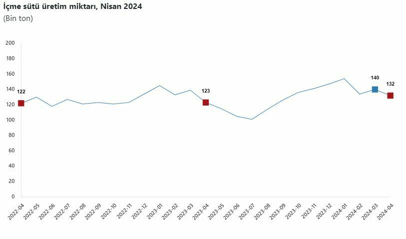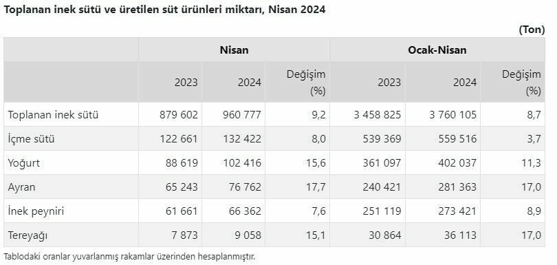 Mart ayında 982 bin 322 ton olan ticari süt işletmelerince toplanan inek sütü miktarı nisanda yüzde 2,2 azalarak 960 bin 777 tona geriledi. Aynı dönemde içme sütü üretimi de yüzde 5,3 azalışla 132 bin 422 ton olarak kaydedildi.